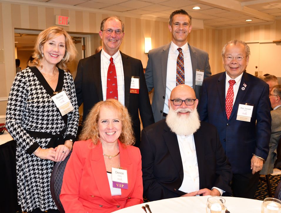 (Seated) new Town Administrator Denise Casey and her husband Jaime Casey and (back row) Town Councilor Stacey Constas, TSF President T.J. White, Town Councilor Jonathan Chines and Representative Donald Wong.